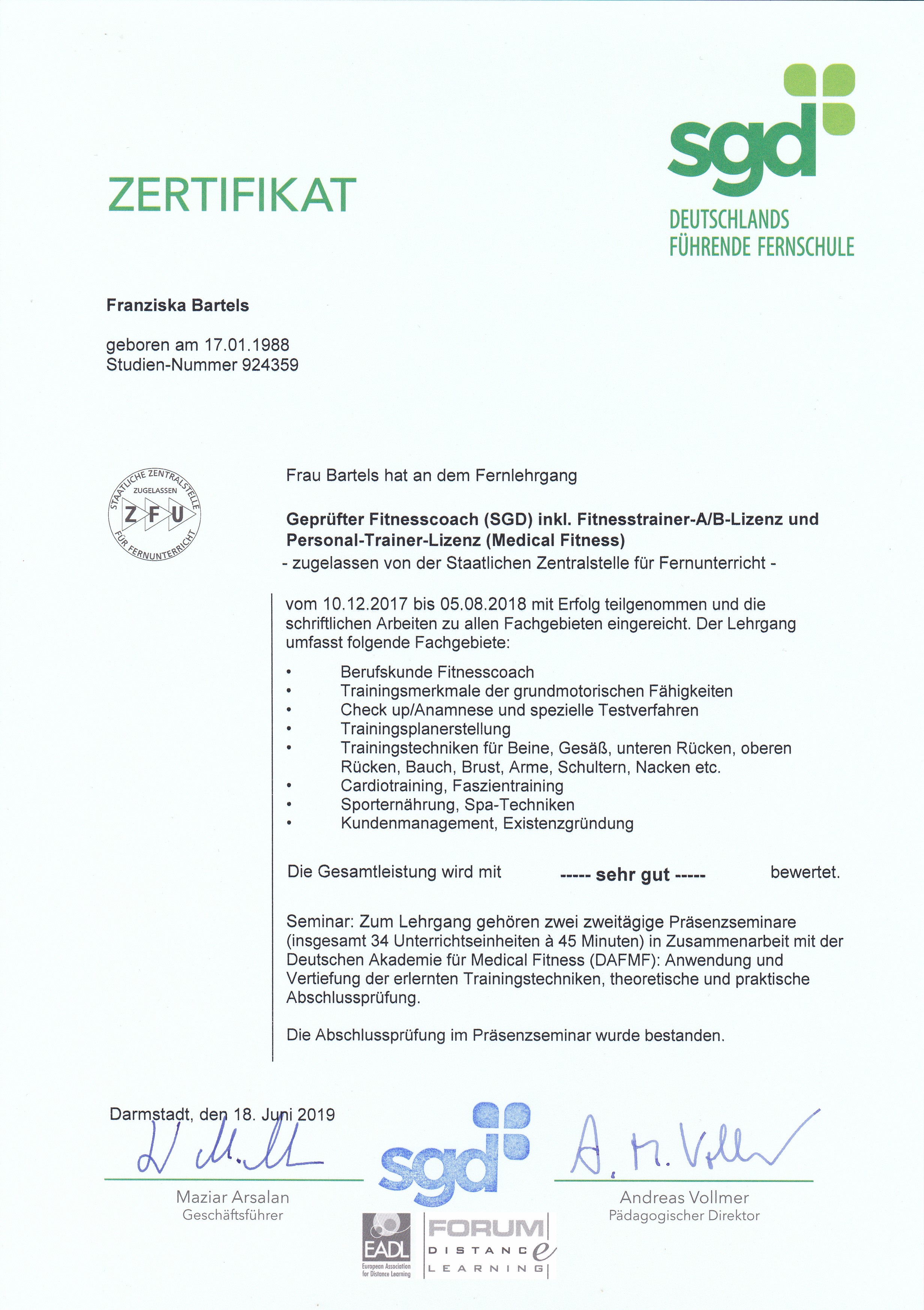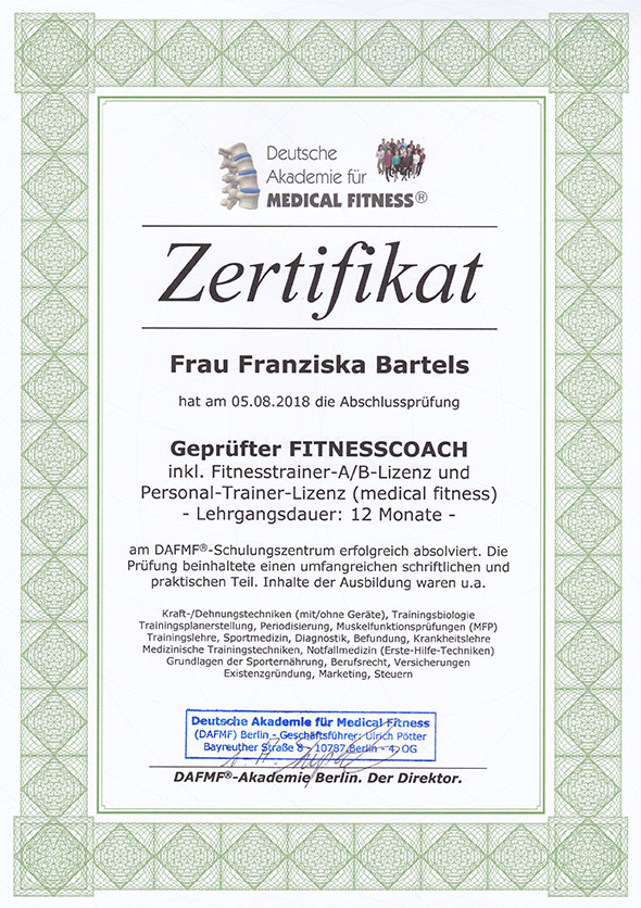 - Studium zum geprüften Fitnesscoach (Fitnesstrainer A- und B-Lizenz)