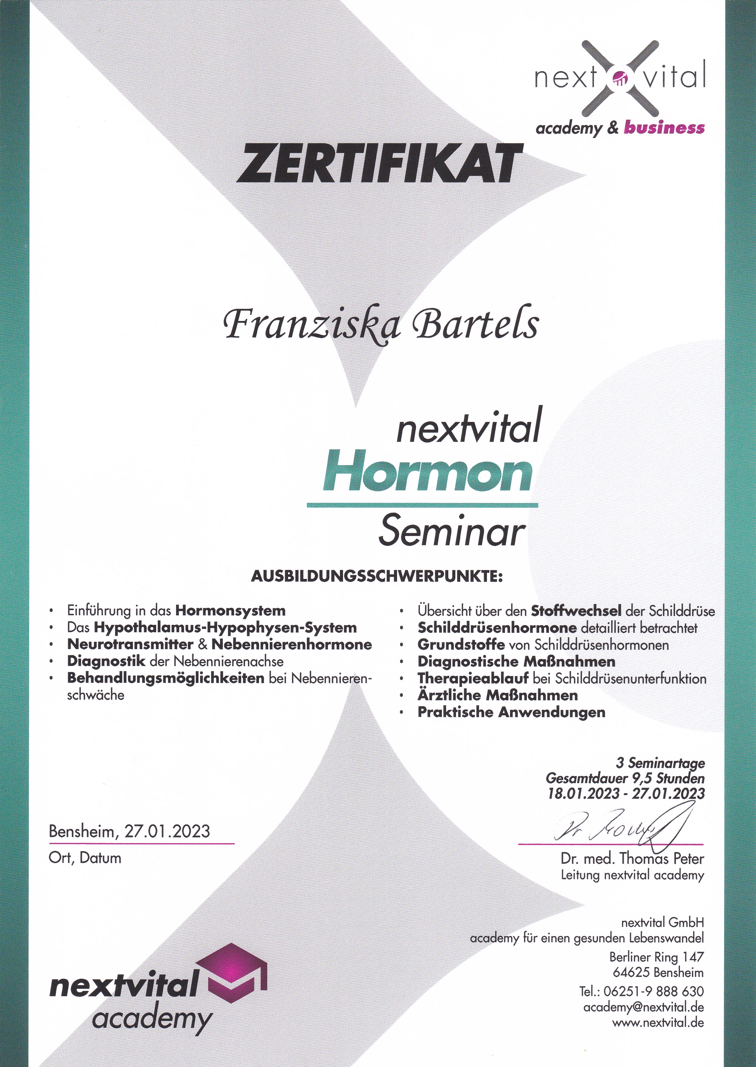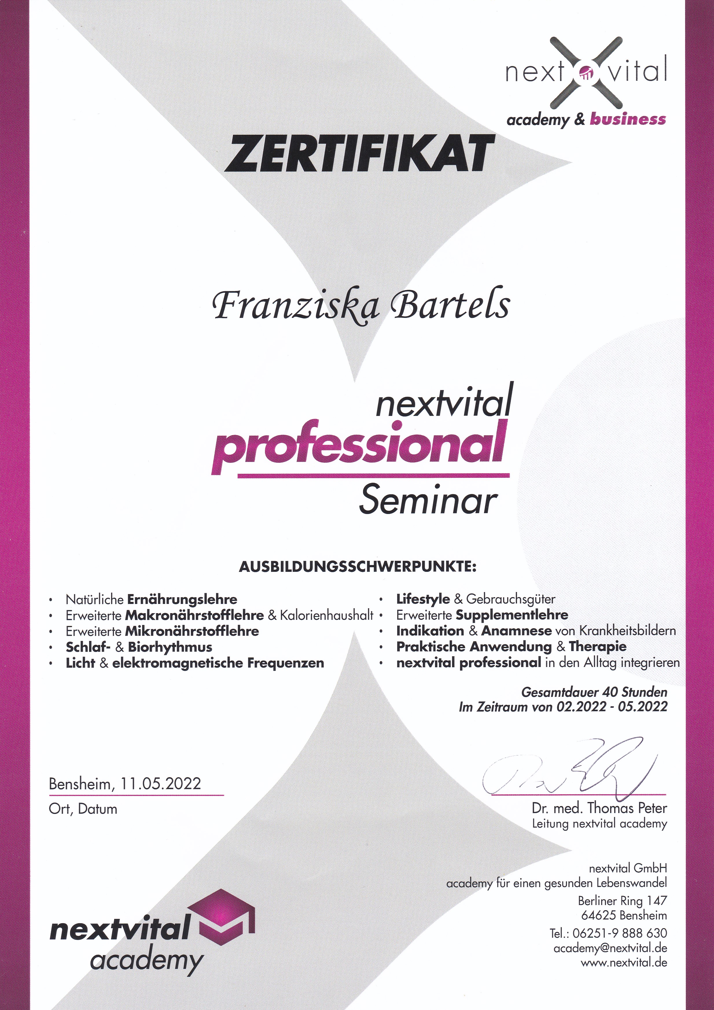 - Nextvital Professional Ausbildung (ausgebildet durch Dr. Thomas Peter)